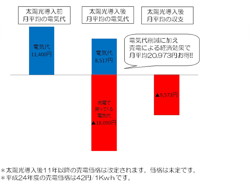 グラフの様に太陽光発電導入後月平均20,973円経済効果が出ています。太陽光発電のシステム費用は今の生活に負担なく約10.5年で償却できるという結果になります。