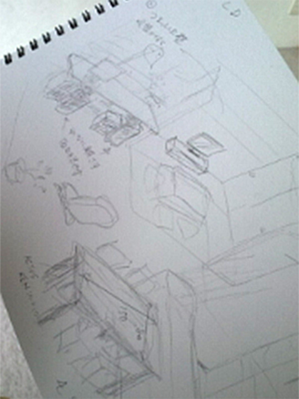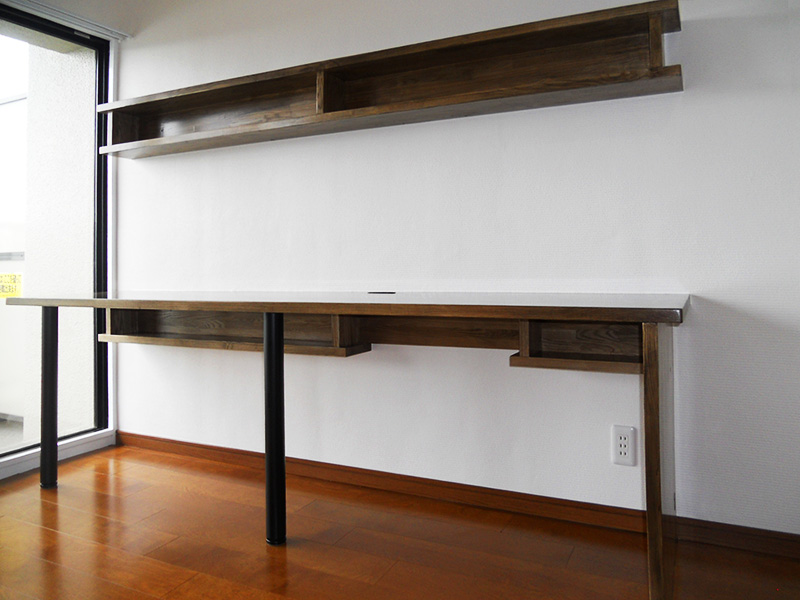 T様が手書きで書いてこられたスケッチを基に造られたデスク&収納棚。持ってこられる予定のラックもピッタリ納まるようになっています。