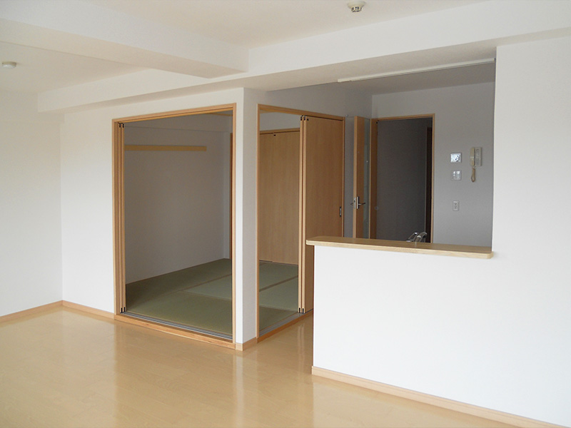 玄関ドアを開けるとまるで新築マンションのよう。2間あった和室を1間にして広々としたリビングスペースに。LDKは夢のオープンキッチンに変貌しました。