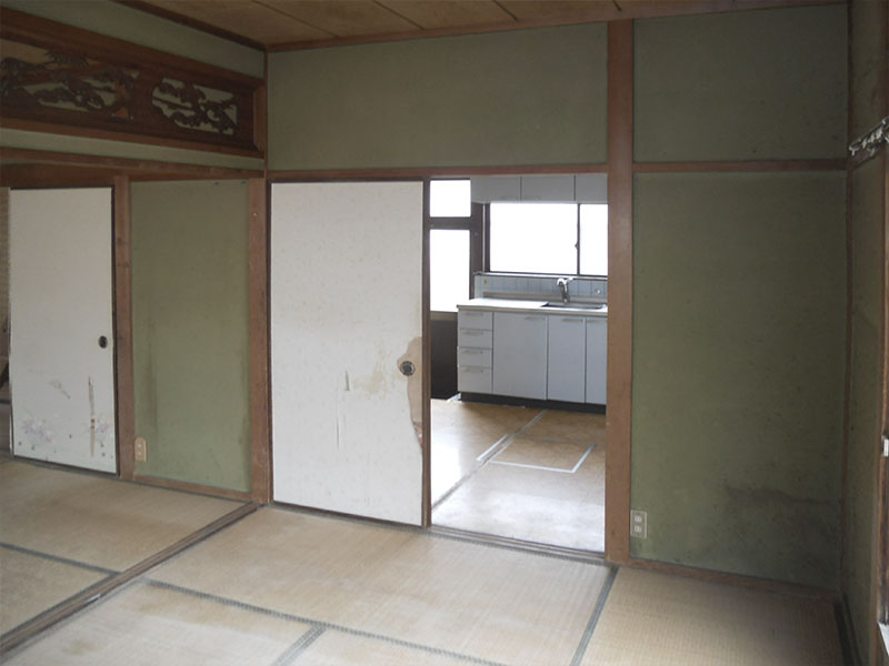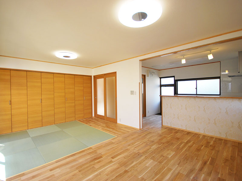 台所・和室二間を一室にした事で畳コーナーもある広々としたLDK が実現!玄関は南欧風にイメージチェンジし、全く以前の面影はありません。