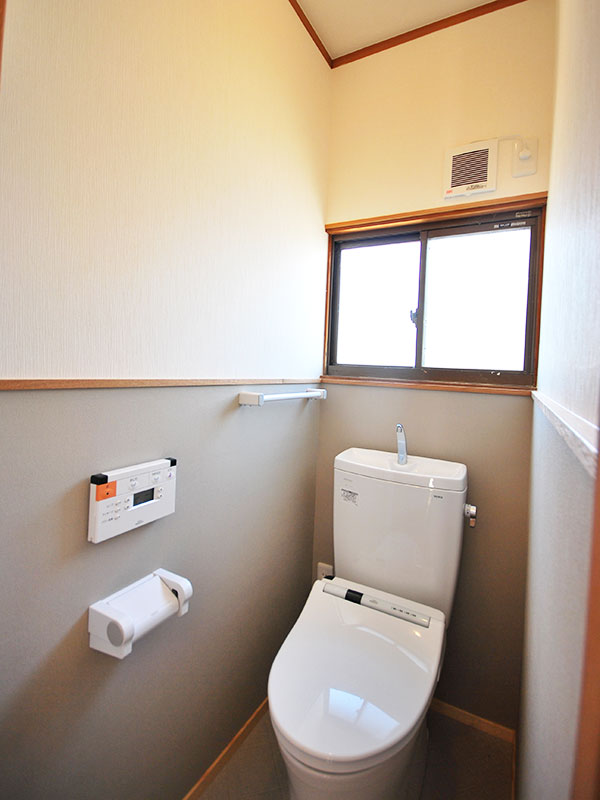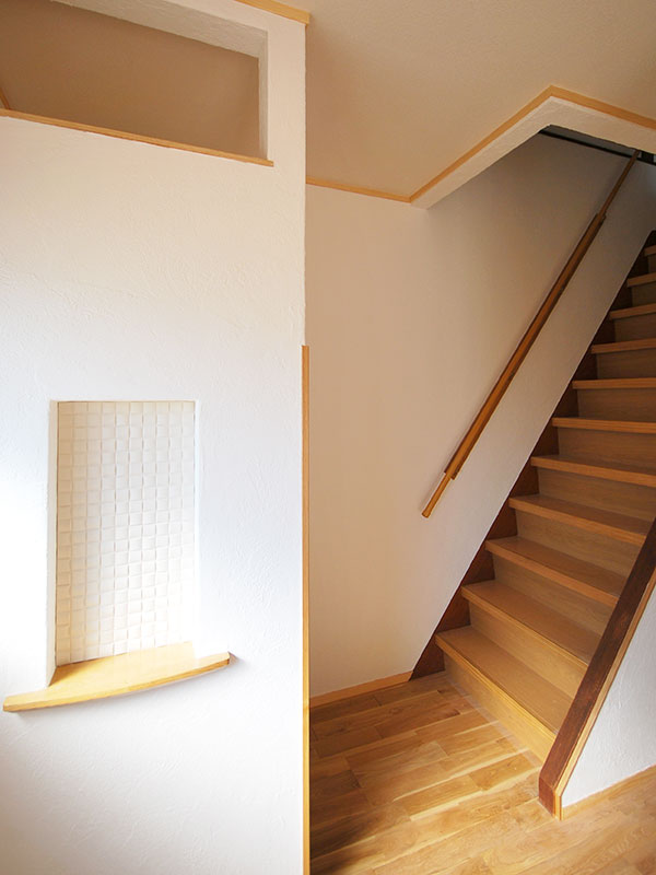 トイレもキレイになりました。窓から日が入りやさしいコントラストの廊下。手摺が付いて安全になった階段。玄関先に設けられたニッチにはエコカラットを採用。