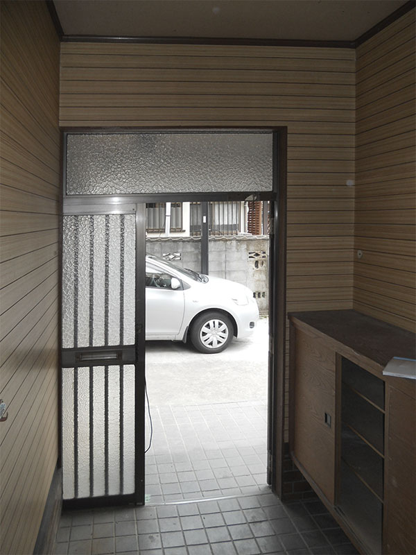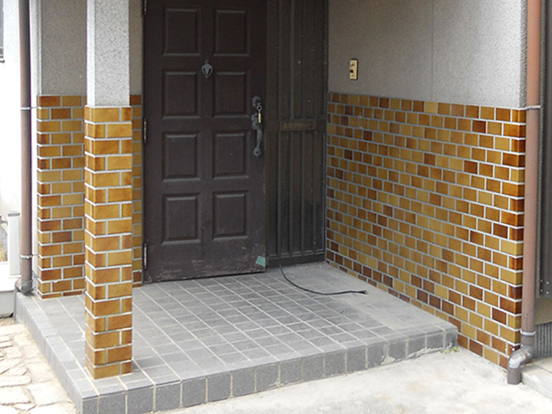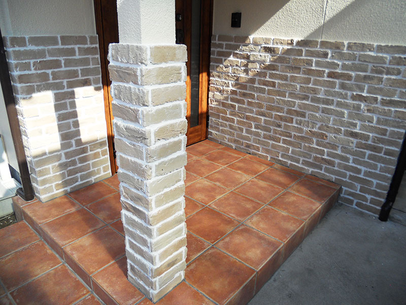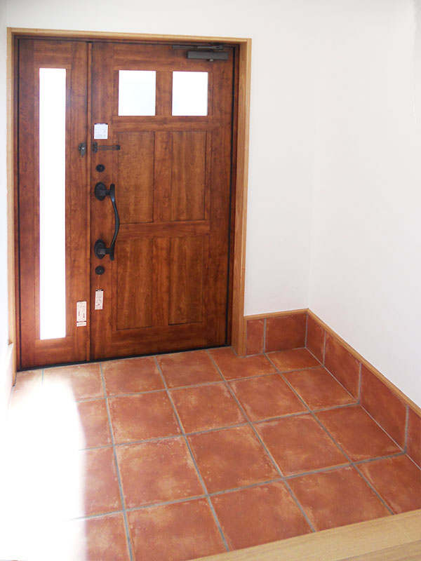 素焼きのテラコッタタイルが貼られ、ガラッと印象が変わった玄関ポーチ。玄関を入ると漆喰と天然木のやさしい香りがただよっています。