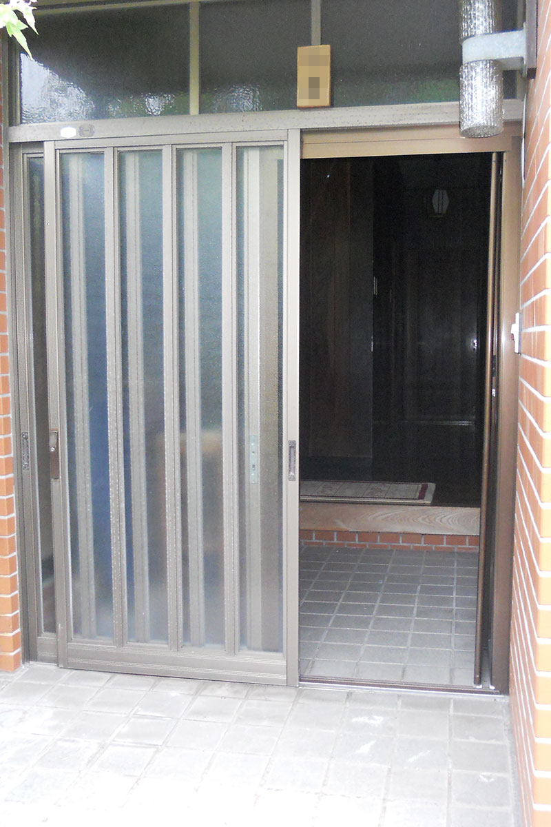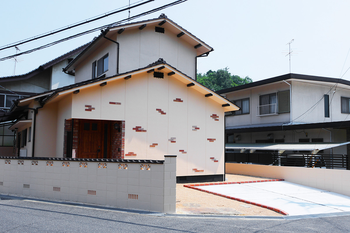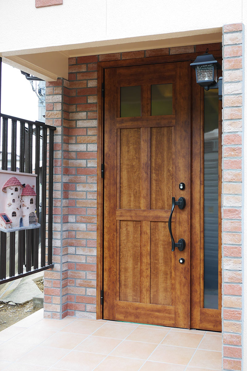 純和風の造りからK様が望まれたアンティーク調の洋風へとイメージチェンジ!引き違い戸だった玄関から開きドアに替え玄関まわりにタイルを施しました。