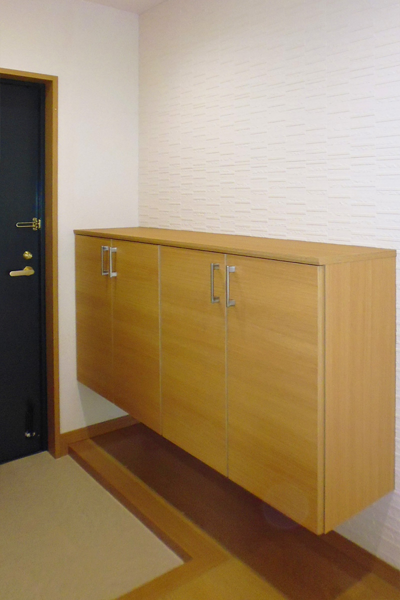 最初から暗さを気にされていた玄関。スッキリした玄関収納にチェンジし圧迫感がなくなりました。壁にエコカラットを貼り明るく高級感のある玄関になりました。