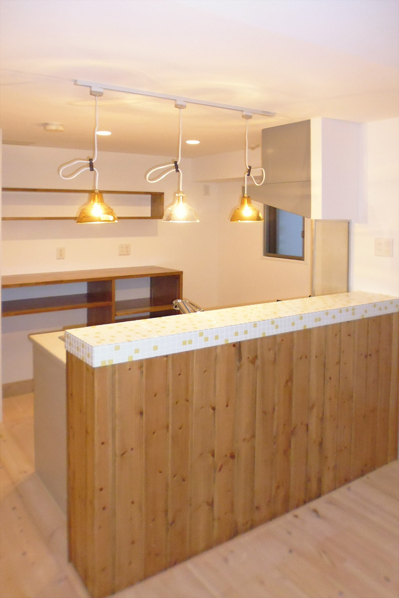 キッチンカウンターはY様の選んで頂いた2色のタイルをランダムに混ぜたオリジナルモザイクタイル♪