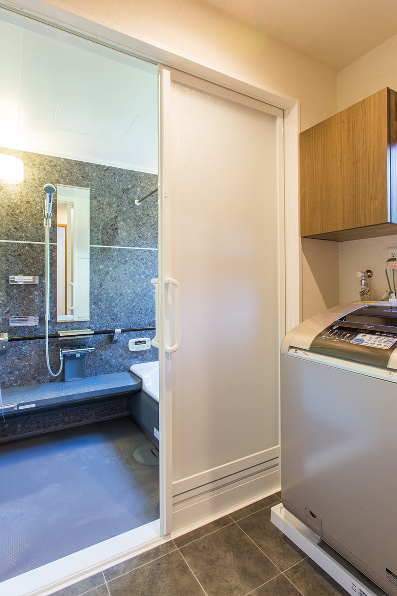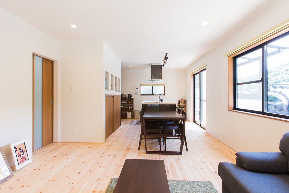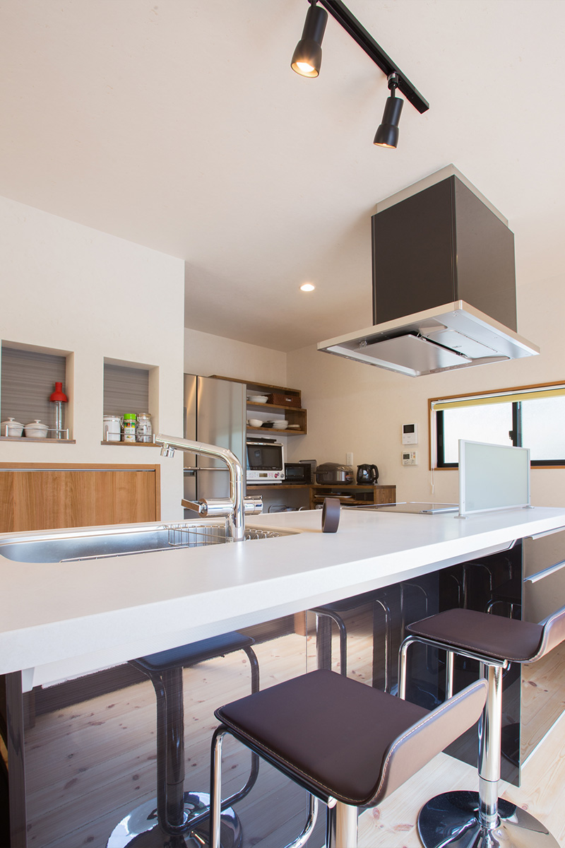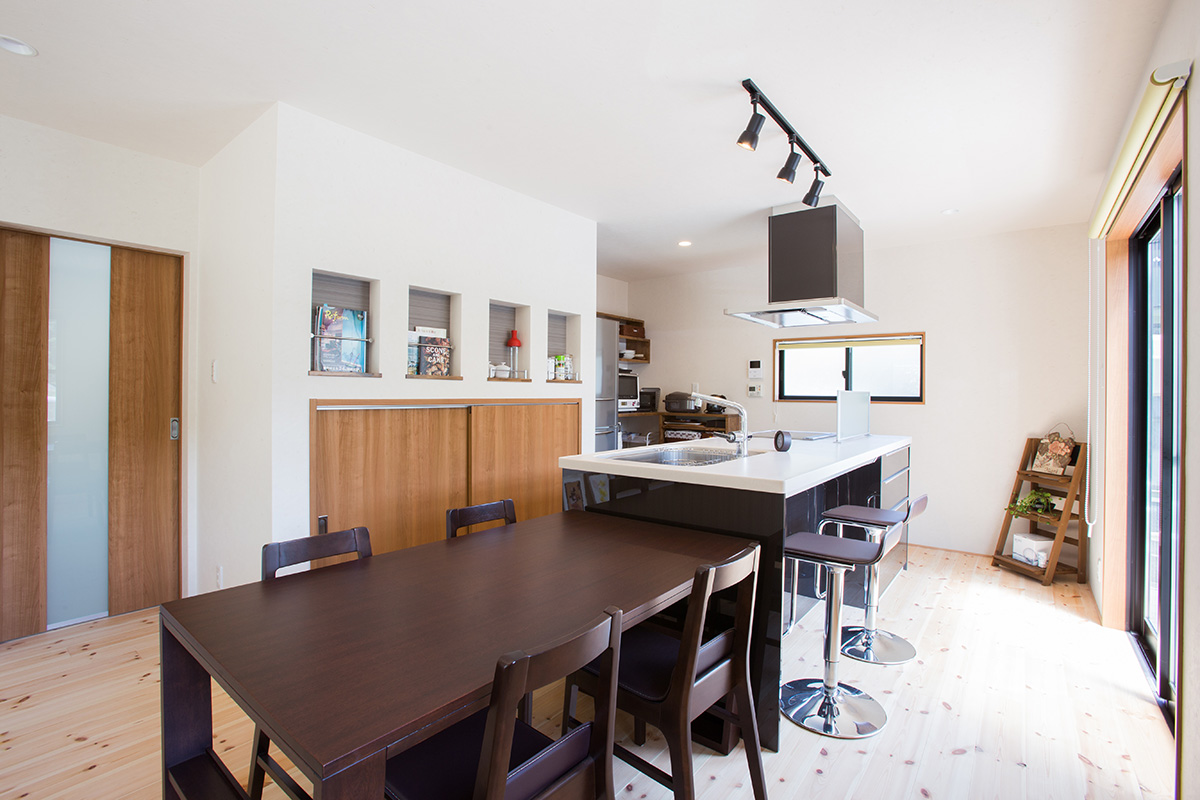キッチン背面の死角になる場所に収納を造り付け、スッキリとして広く明るく感じられるLDKになりました。