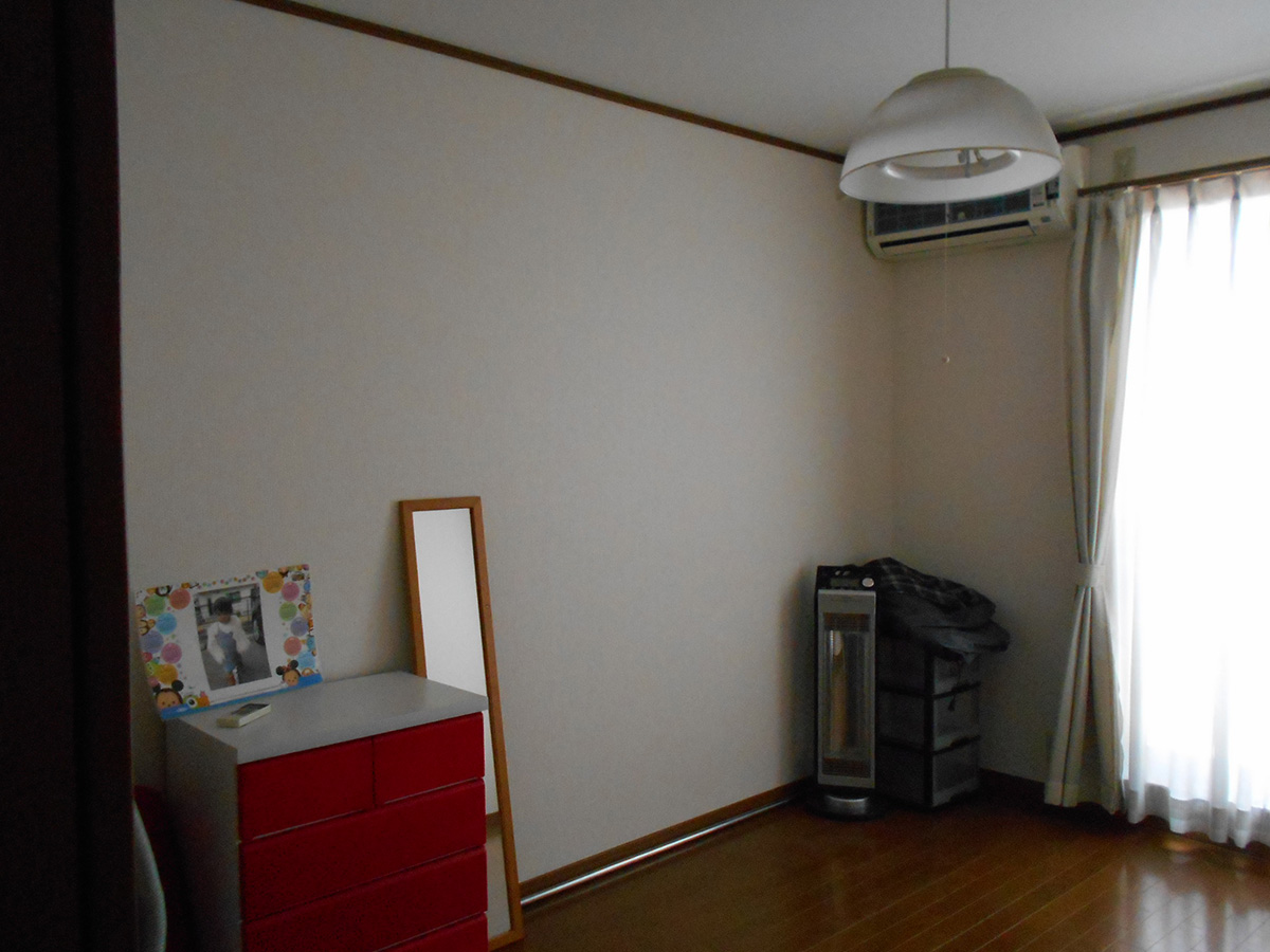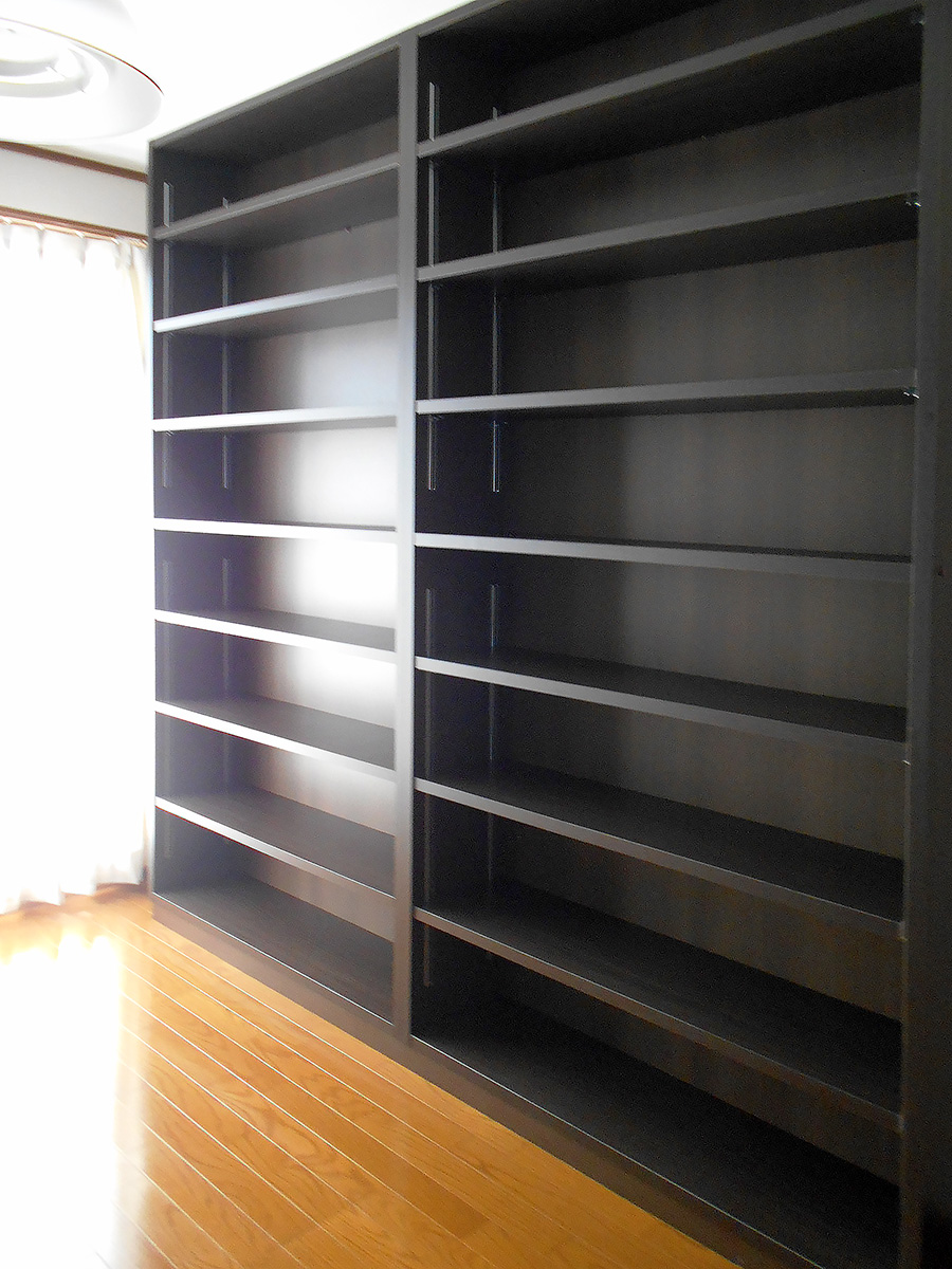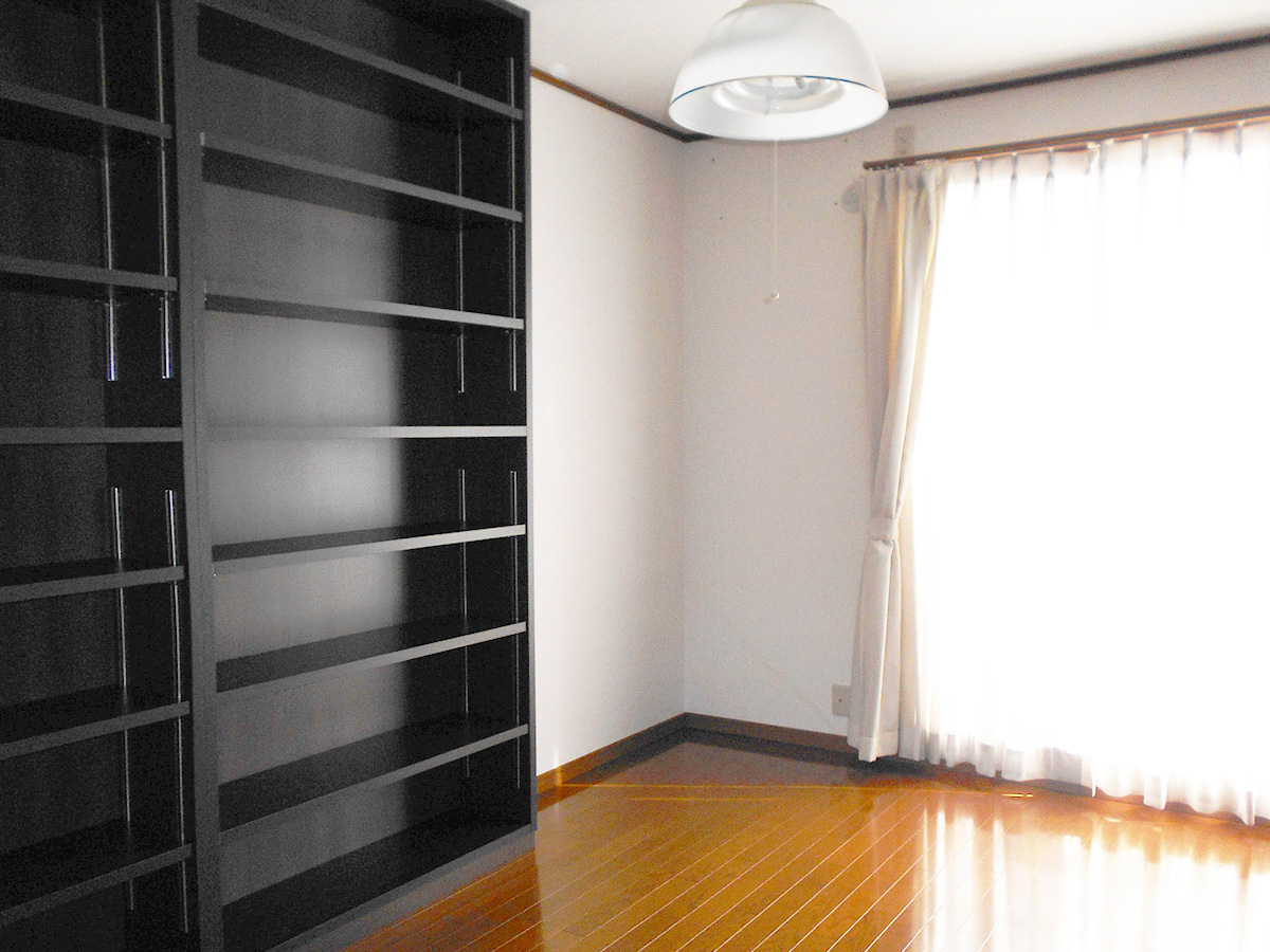 大量の本をお持ちのM様の一番の希望だった壁一面の本棚。反対側の壁にも一面本棚を備え、本に囲まれた空間に。本好きにはたまらないお部屋になりました。M様、ありがとうございました!