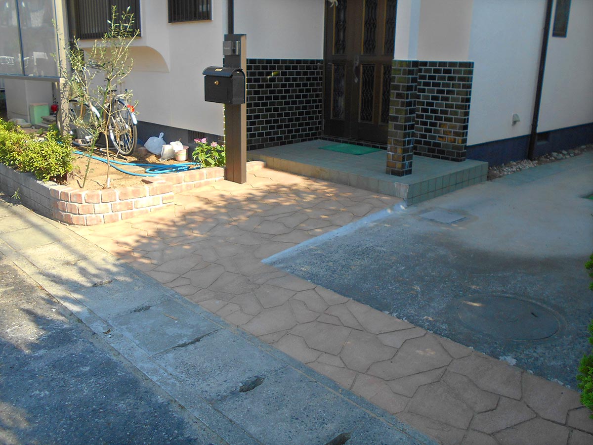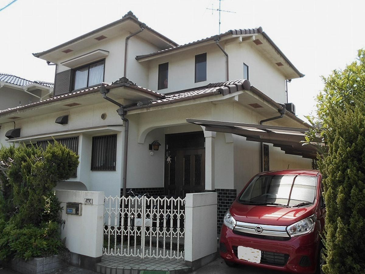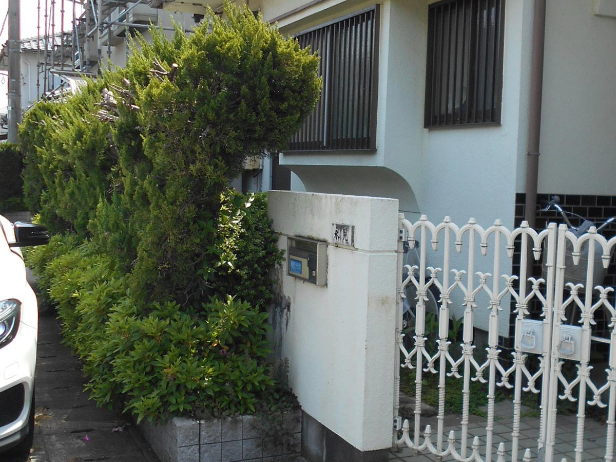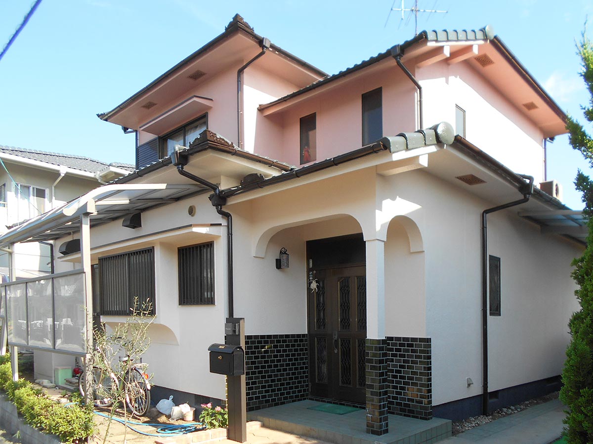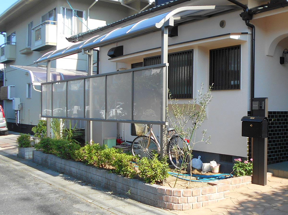 屋根・外壁は極端に劣化した状態ではありませんでしたが前回の塗装からメンテナンスサイクルを考慮し、そろそろ塗装しておきたいという要望で全塗装をしました。玄関周りアプローチは昭和50年代のお宅でよく見られるカイヅカの垣根に囲まれていて手入れも大変な様子。塀や門扉もあるクローズ型からオープン型の玄関アプローチに!カイヅカを撤去したことで生まれたスペースにテラス屋根を設け、自転車などを置けるようにしました。