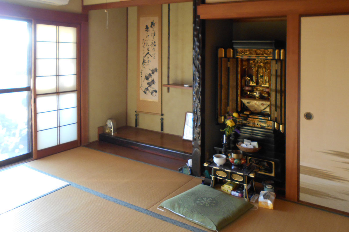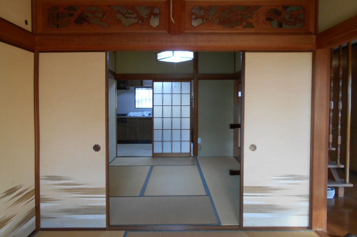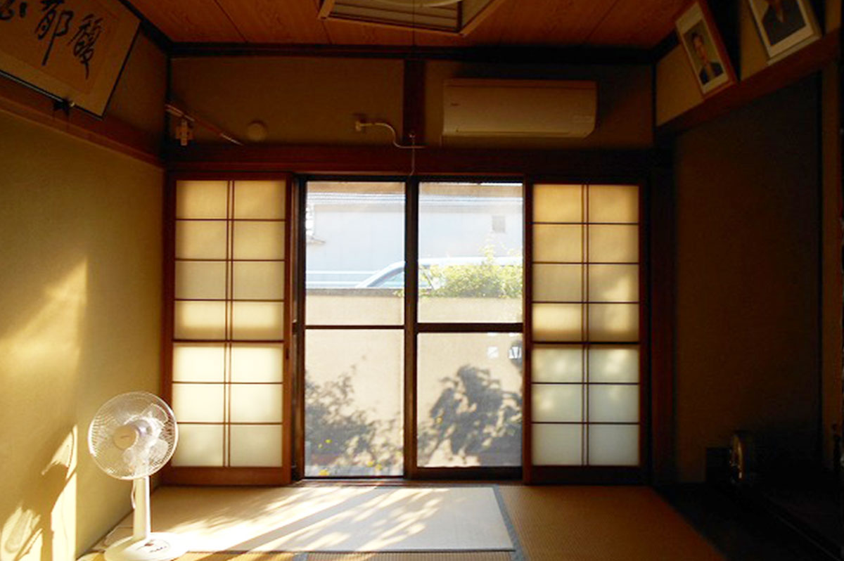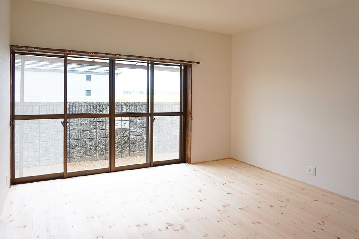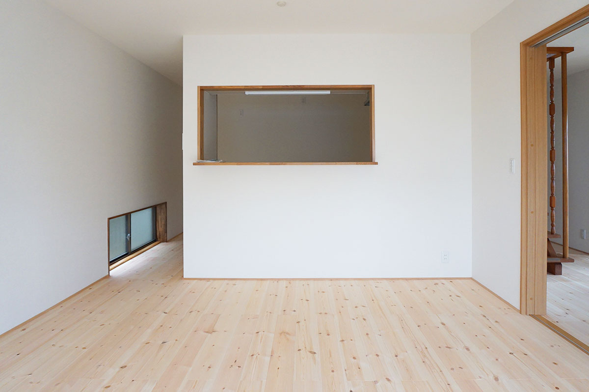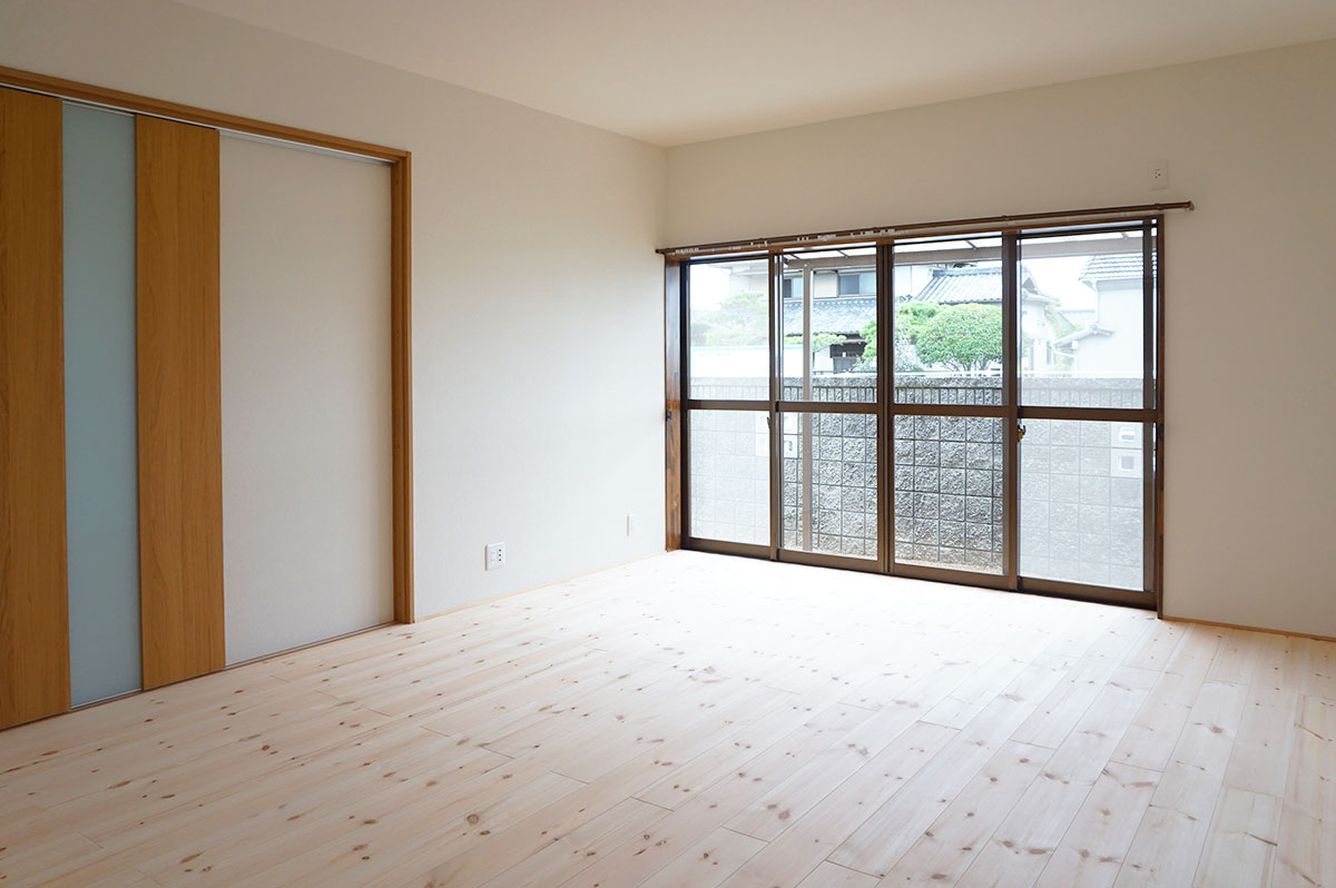 昭和55年築の木造住宅。二間続きでジュラク塗り壁の和室だったところを一室に繋げ、無垢フローリング貼りの明るいLDKにしました。