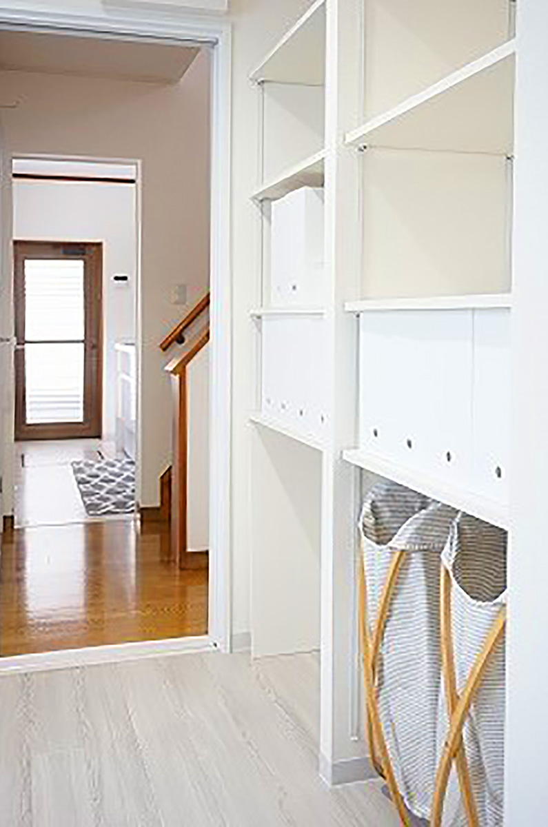 O様こだわりの洗面室収納。隣の和室の床の間を壊し洗面側に壁一面の収納を設けました。意外と物が増える洗面室がスッキリ!