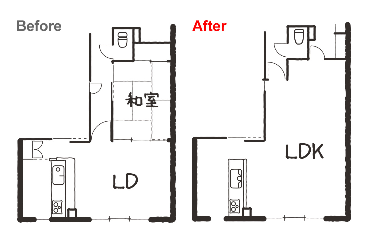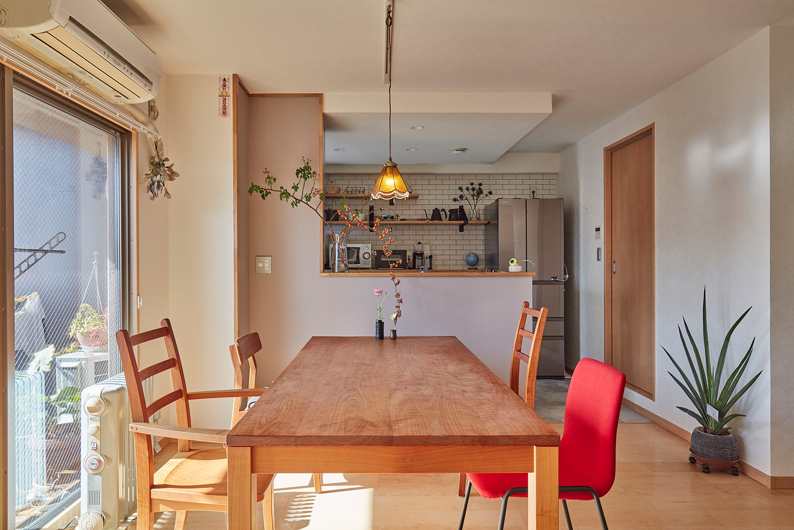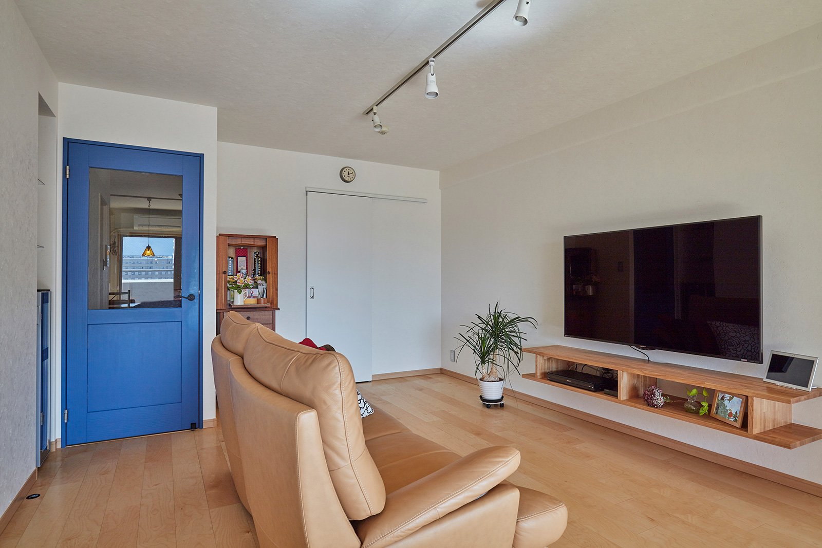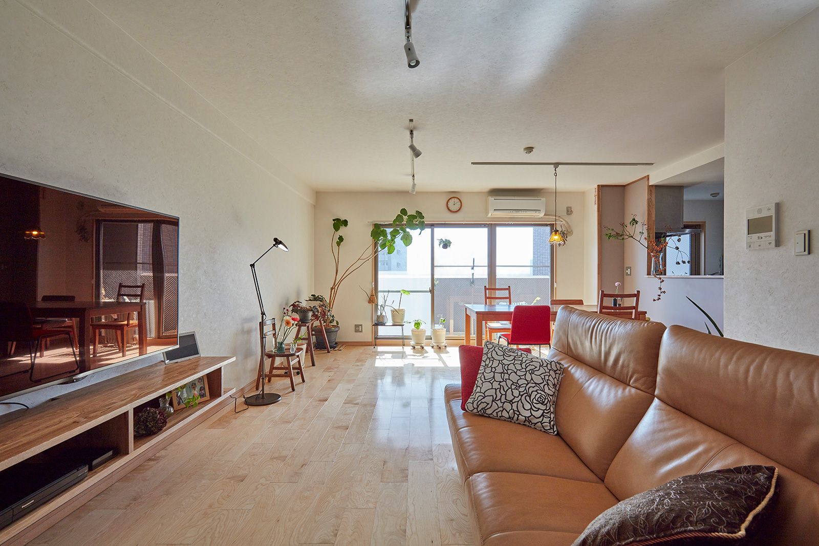 とにかく開放的で明るいリビングにしたい、とのご要望で間仕切りを撤去しオープンに。家の中で一番暗い部屋だった和室は壁・建具を撤去しリビングに取り込みました。