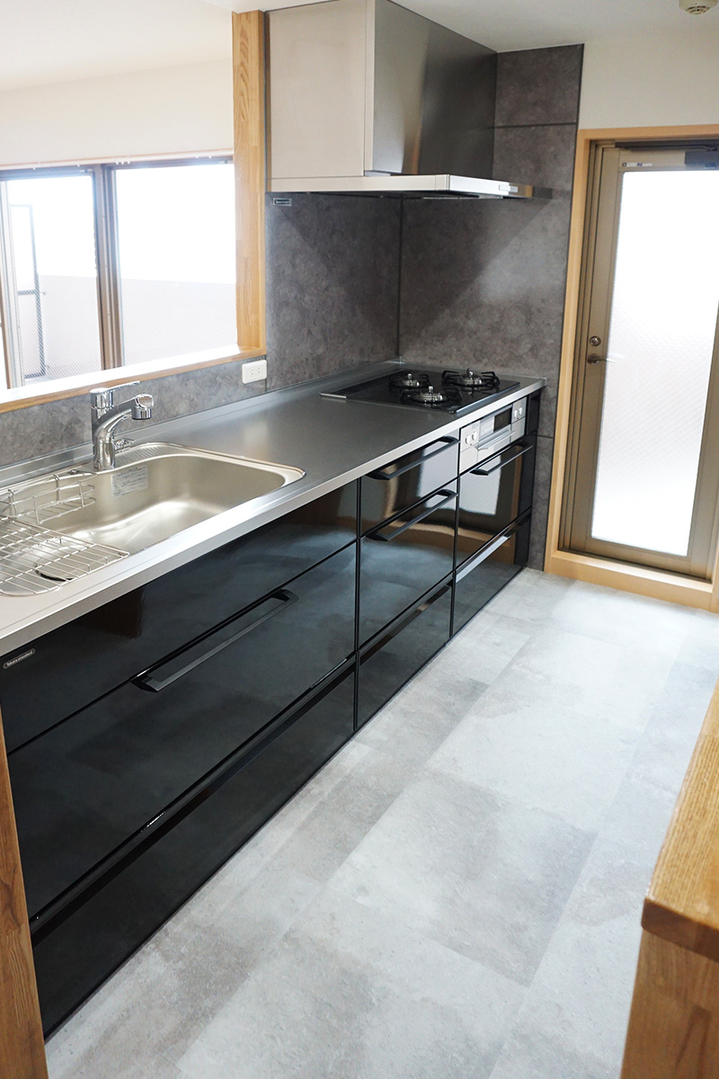 玄関クローク、ブラックのキッチン、造作の洗面台、手塗りのリビングドア