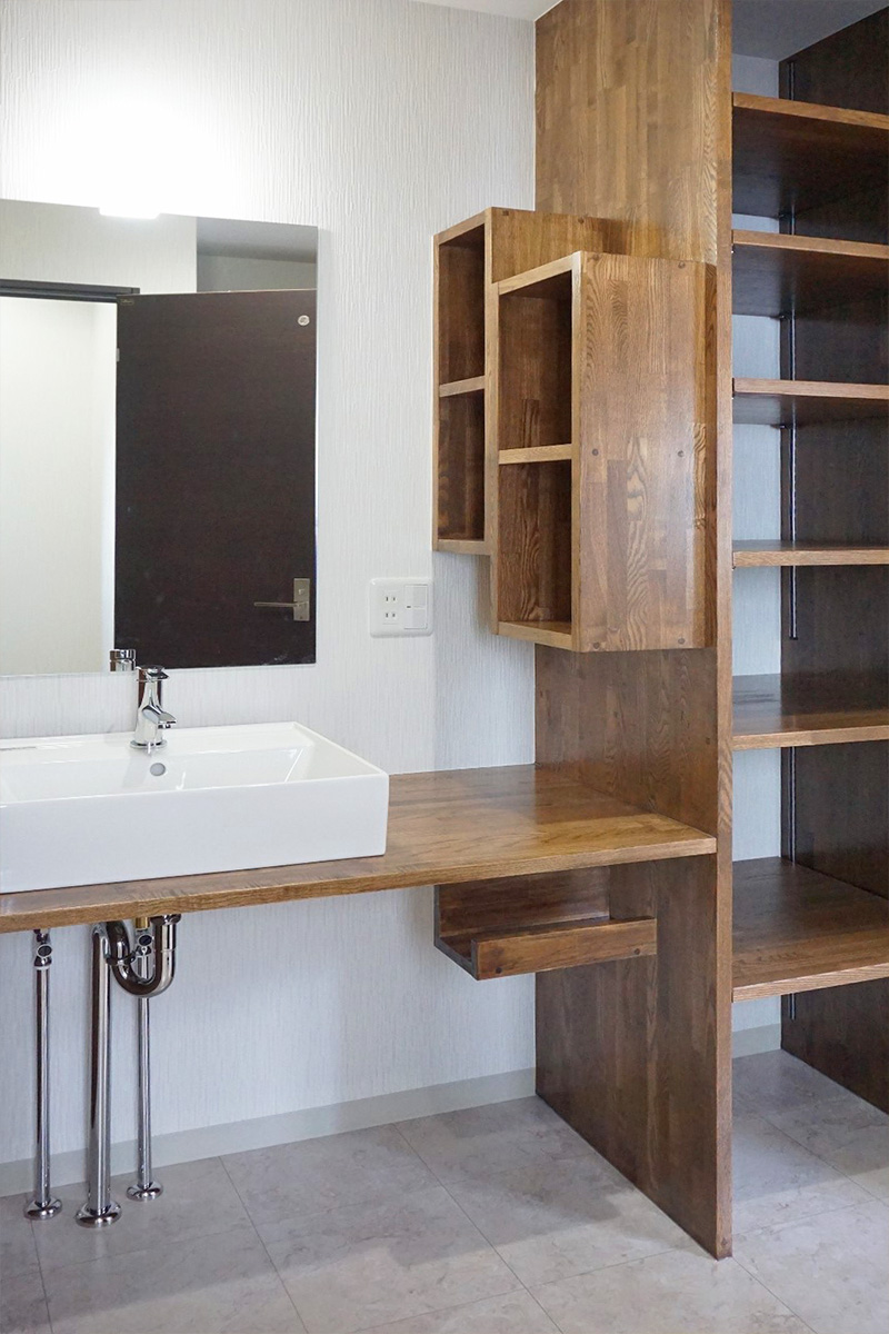 洗面所にも大容量のオリジナル収納を設置。