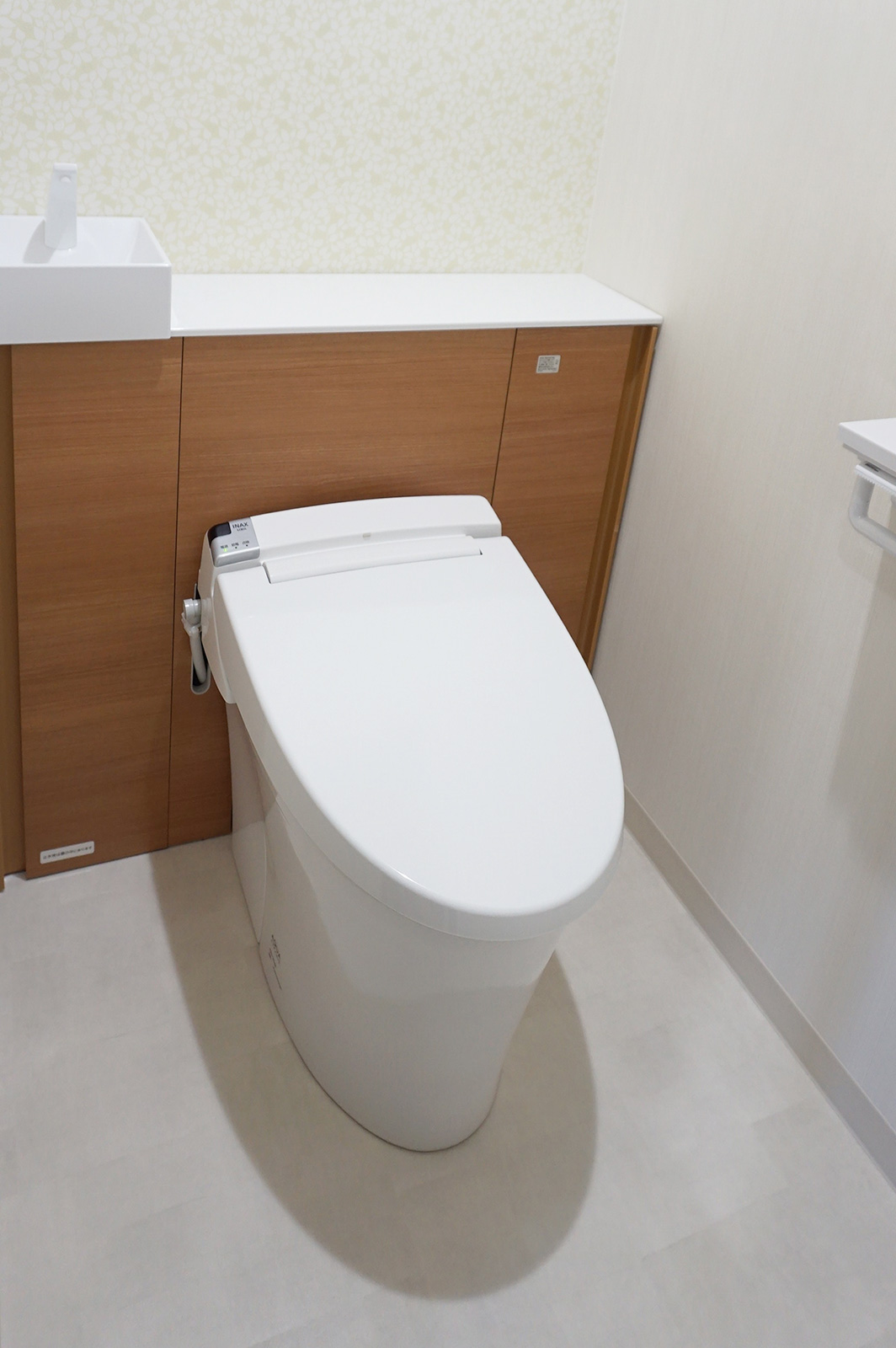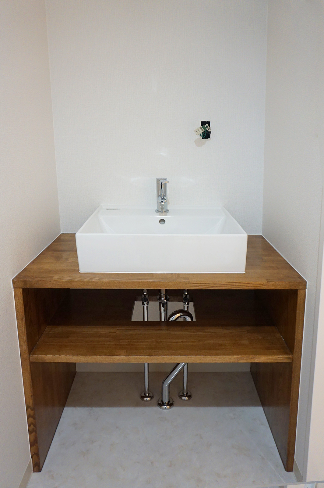 水回り設備機器はすべてY様ご夫妻が選ばれたもの。お手入れのしやすさを重視して選ばれたそうです。 玄関収納はあえてオープン棚に。