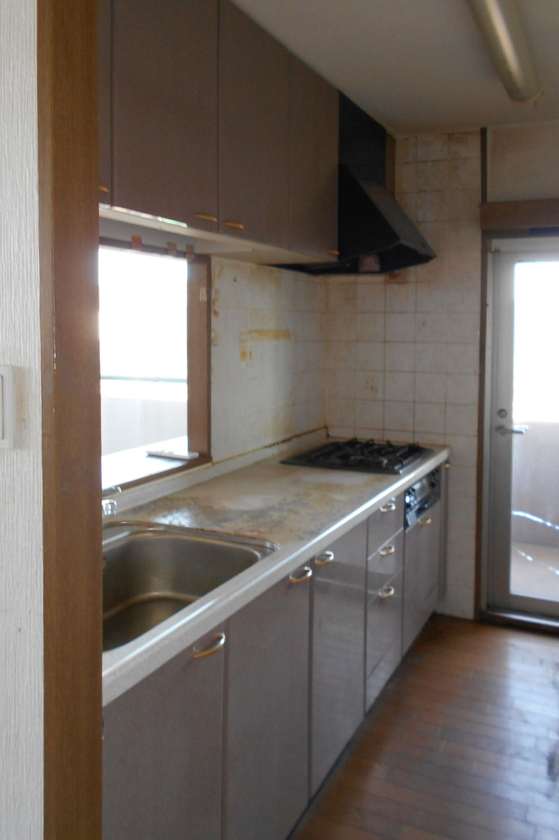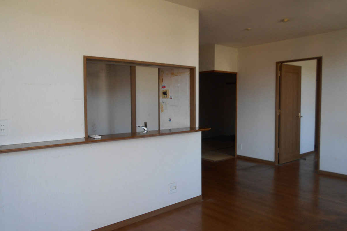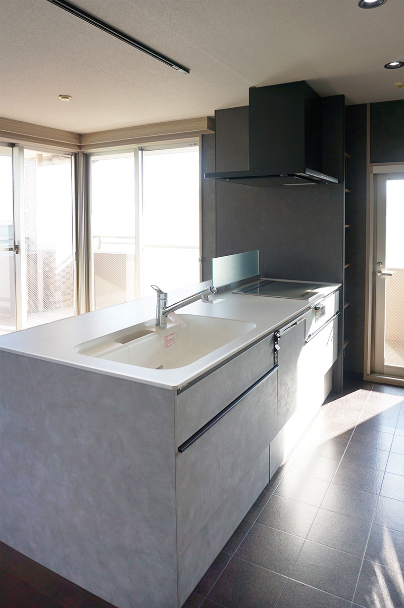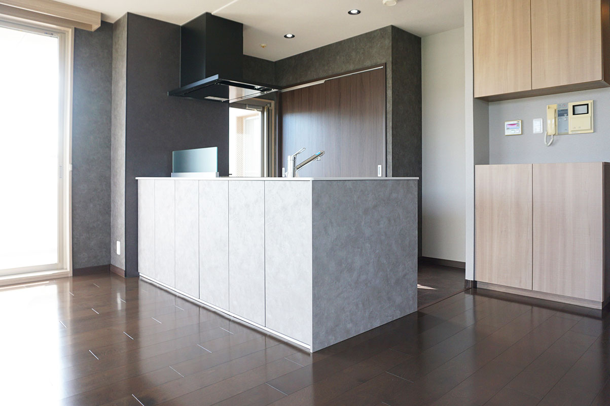 当時のマンションで良く見られる吊戸棚があって、カウンターがある対面キッチンからフルオープンのフラット対面キッチンに☆キッチンが主役のスタイリッシュなLDKになりました。