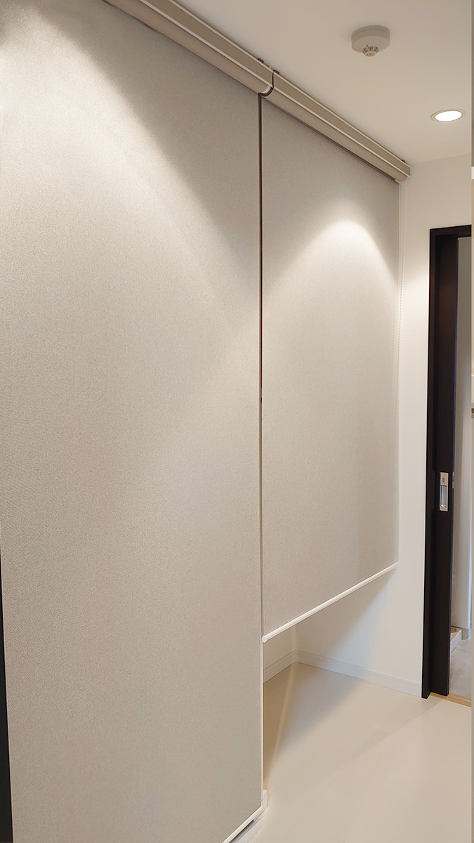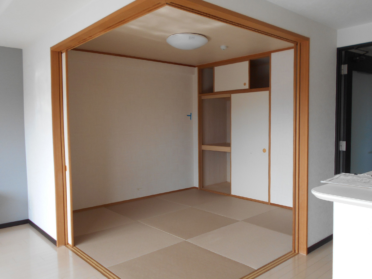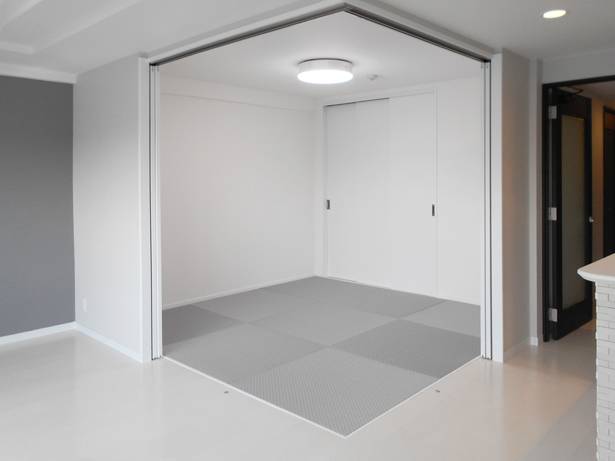 LDKはホワイト+グレーを基調にコーディネート。リビングから続きの和室は解放していることが多いのでそのままでは少しイメージが違うとの事で、建具を全てホワイトカラーの物に新調し、畳はカラー畳のグレー色を採用しました。これでオープンにしていてもLDK全体がH様の希望の空間になりました。