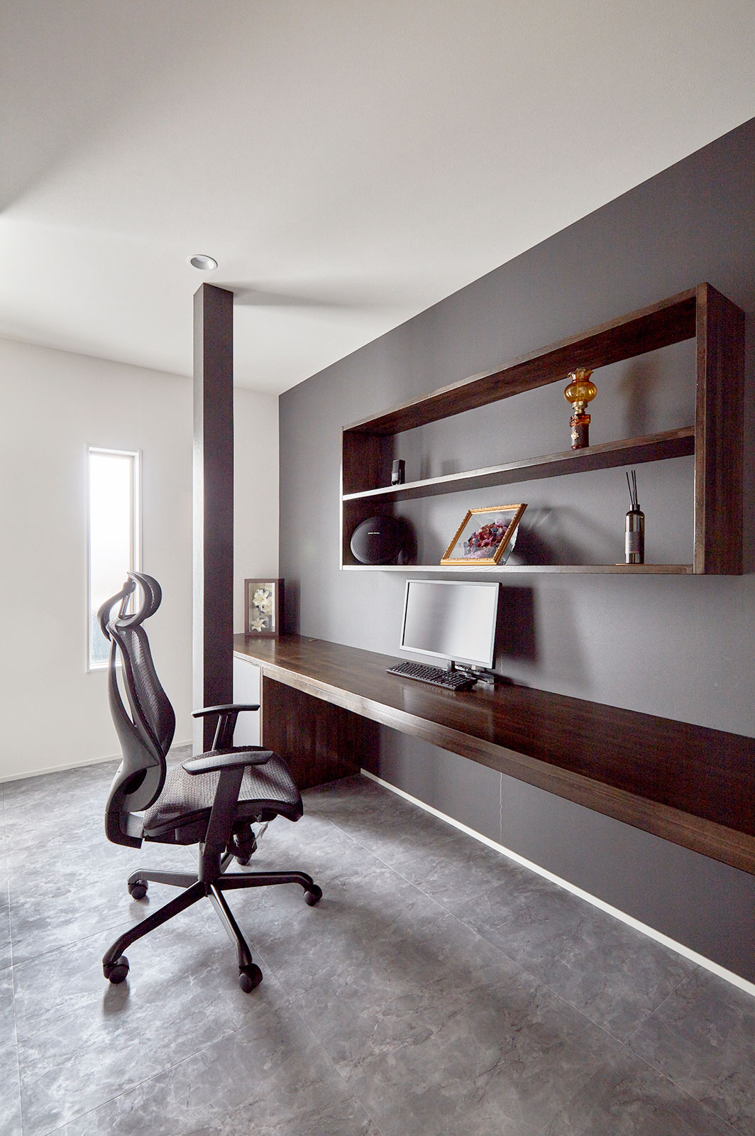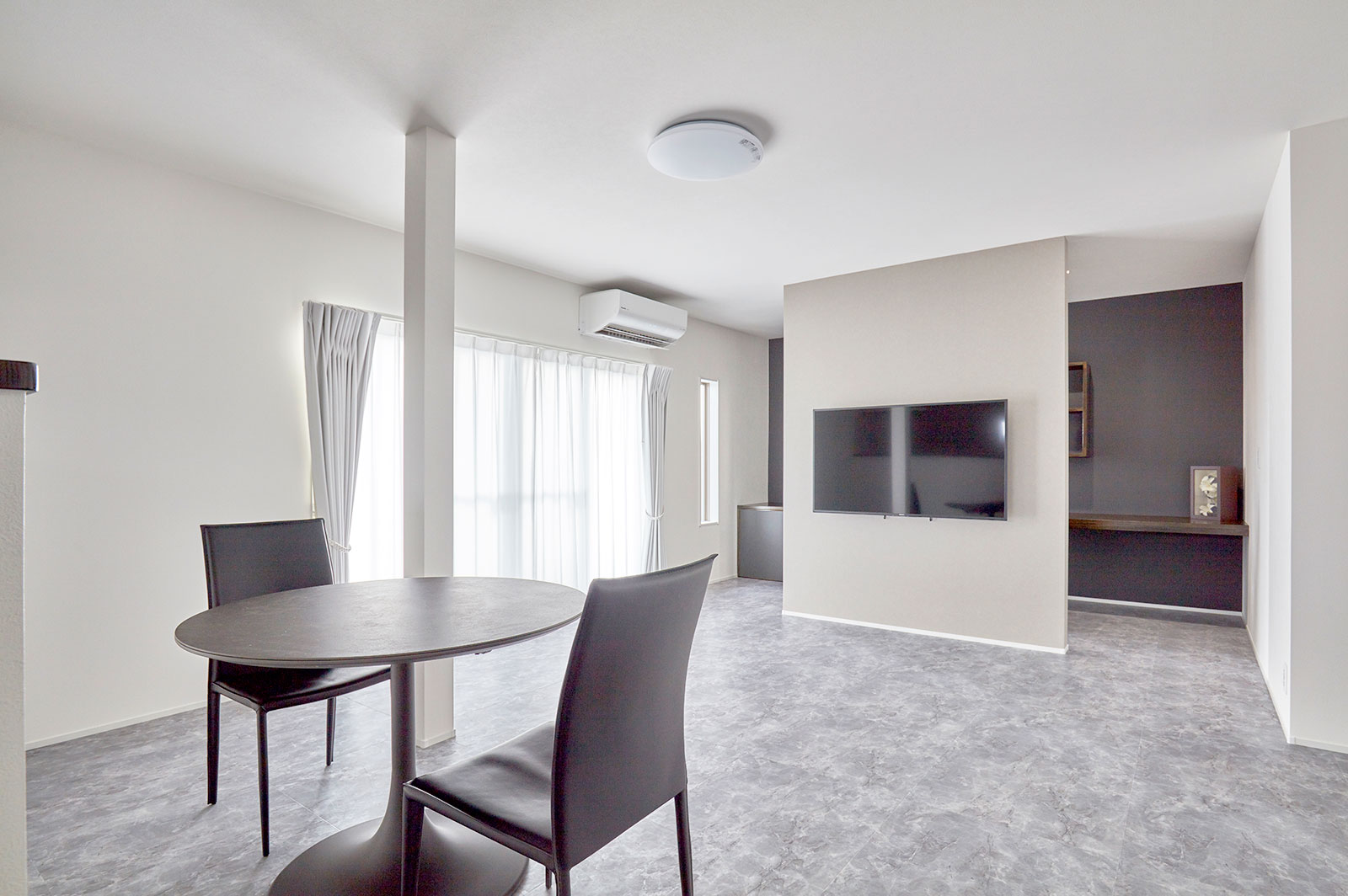 昔ながらの二間続きの和室に広縁という間取りから間仕切りを取り払い広々としたLDKに。リビングの奥にはご夫婦が並んで使える書斎コーナー。カウンター+本棚はすべて造作でオリジナル。N様の希望を形にしたものです。