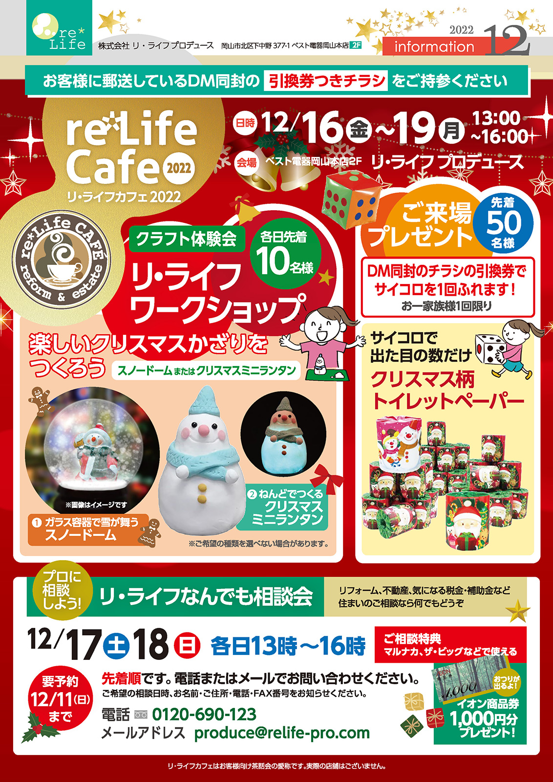 その他、わくわく楽しいイベントが盛り沢山!お子様も一緒に楽しめる「ワークショップ」では、クリスマスにピッタリなスノードーム又はミニランタンが作れます♪今年一年の感謝を込めて、リ・ライフプロデューススタッフ一同 皆さまのご来店を心よりお待ちしております。