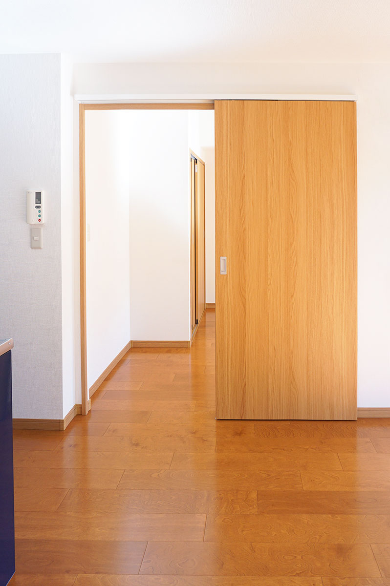 LDKから続く洋室の入口ドアは上吊りタイプの引戸に交換したことで敷居もなく、完全バリアフリーになりました。段差のストレスが無くなり、家事導線も向上!