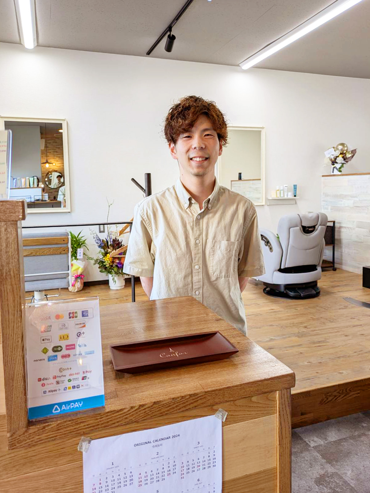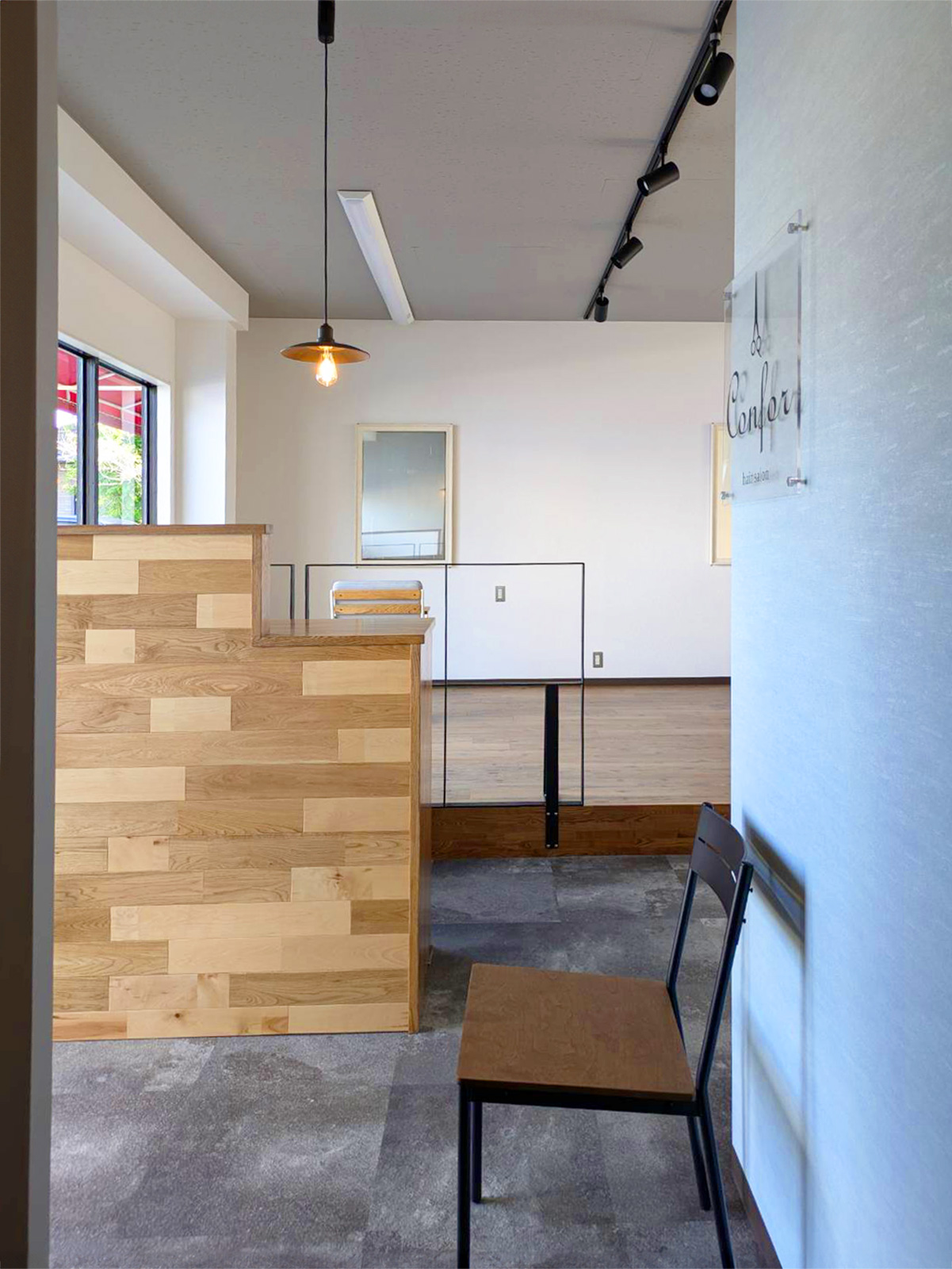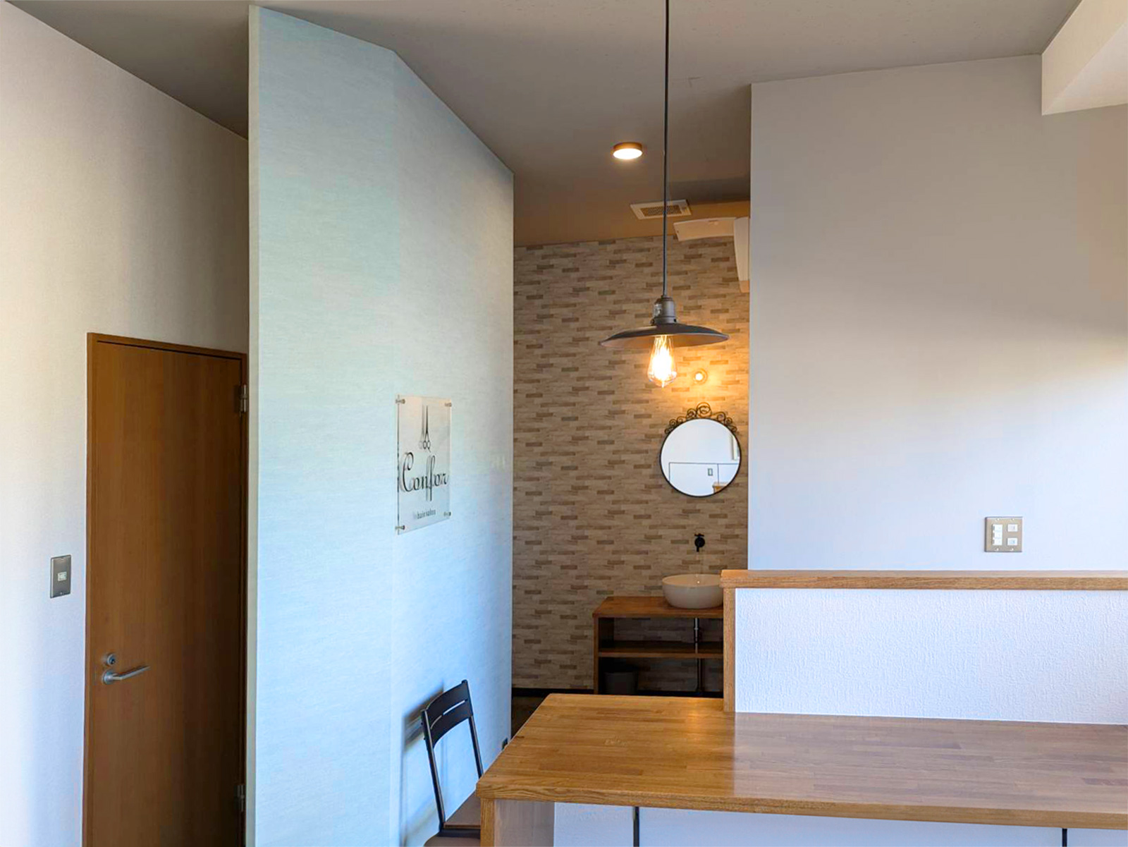 お店の名前“コンフォール”(フランス語で“快適・安らぎ”という意味)に合わせてシンプルながら温かみがあってお客様にとって居心地の良いサロンに仕上がるようご提案させていただきました。