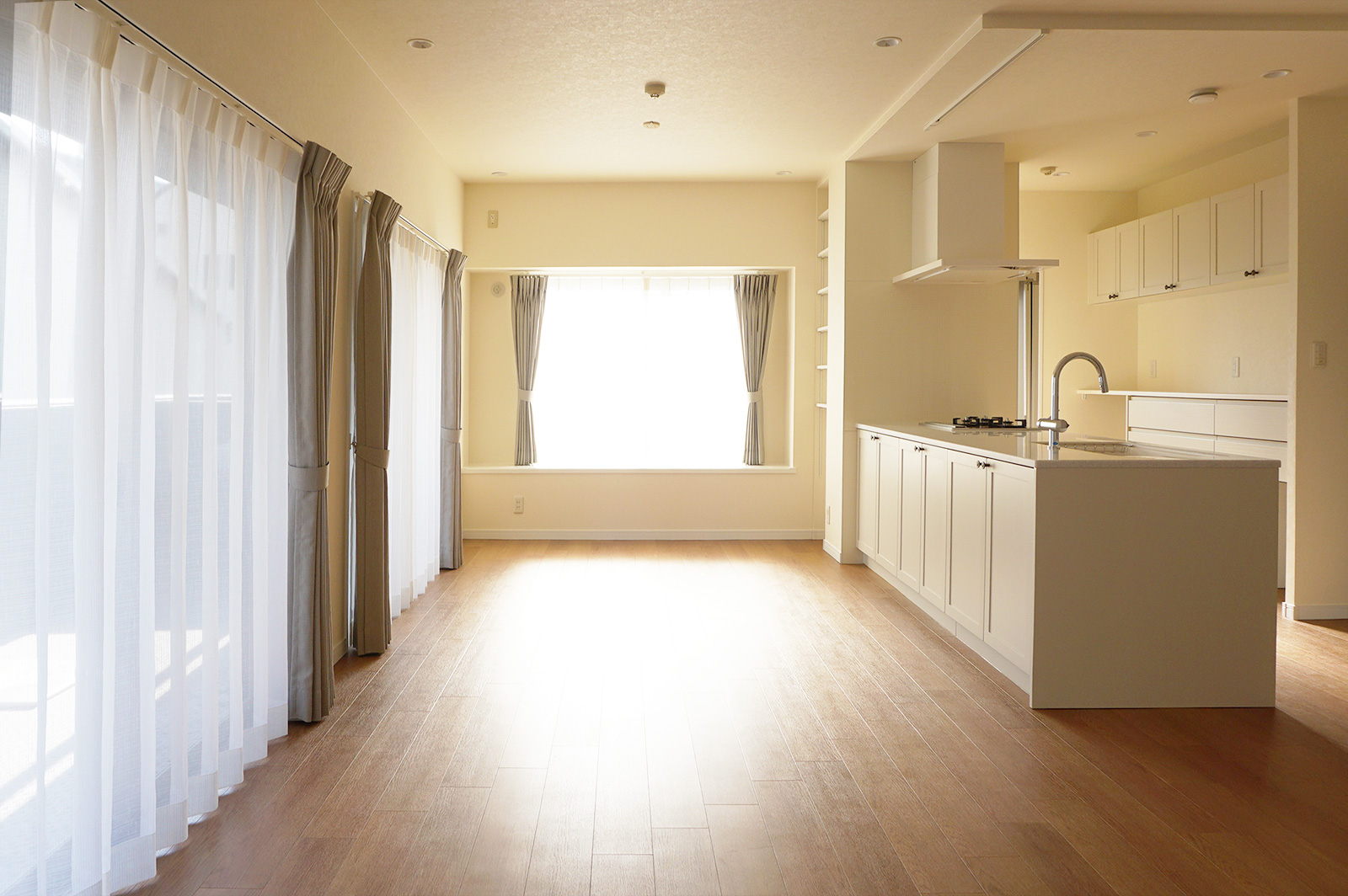 中古マンションを購入されたE様。前所有者様がとても丁寧に使用されてはいたのですが、築後約20年が経過しており、内装デザイン全体がその当時に流行ったダークトーンでした。家族が一番長い時間を過ごすLDKだけはお気に入りのテイストにしたい!というE様奥さま、たっての希望を叶えるべく打合せを重ね、夢が形になりました!